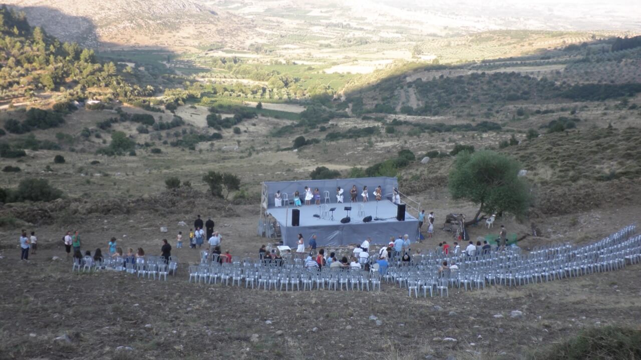 Το θέατρο όπου ετελούντο καλλιτεχνικοί αγώνες προς τιμήν των Μουσών έχει οικοδομηθεί στους πρόποδες του Ελικώνα.