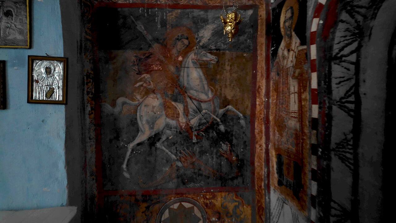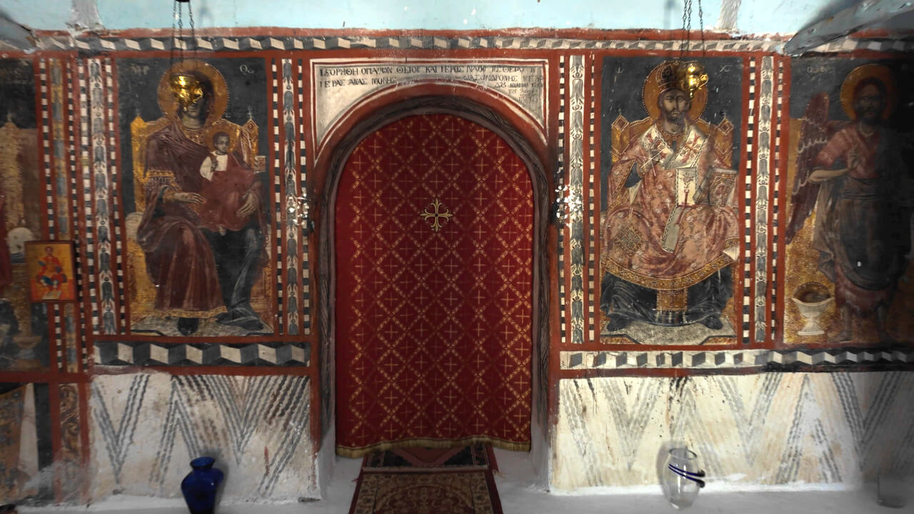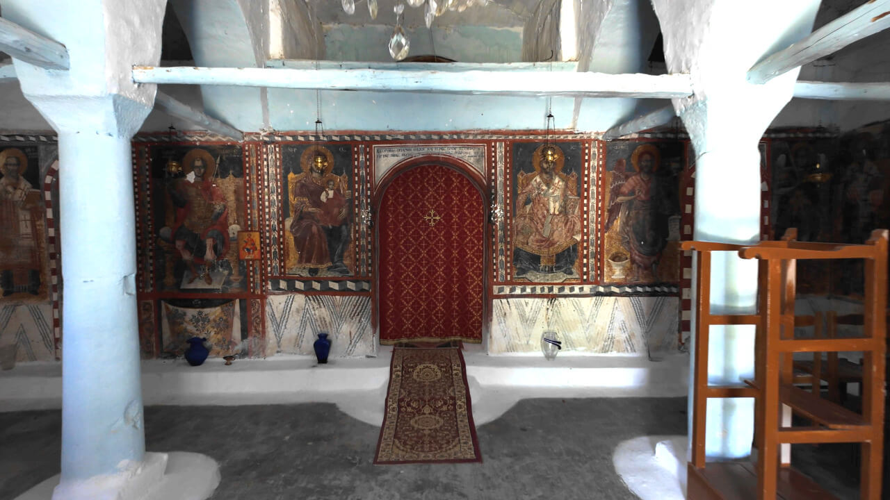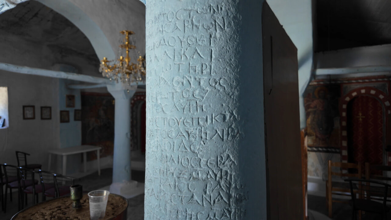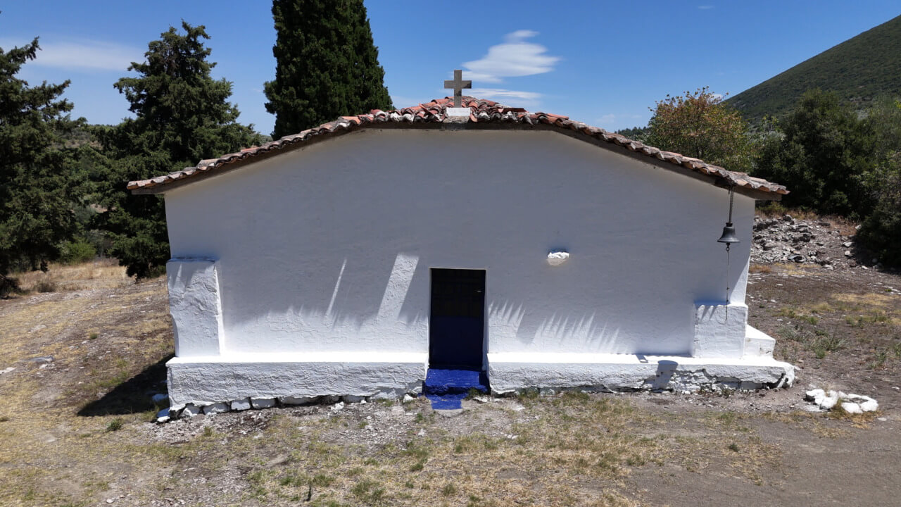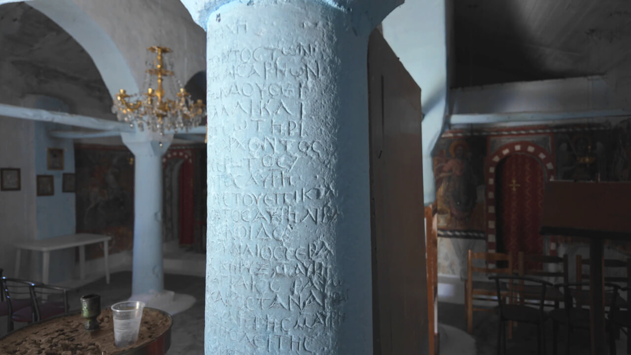 Στο εκκλησάκι αυτό με τις ωραίες αγιογραφίες του 1842 δεν είναι δυνατόν, λόγω των πολλαπλών επιχρισμάτων, να εντοπισθούν υλικά που χρησιμοποιήθηκαν από αρχαίους ναούς, με εξαίρεση τον υποβλητικό κίονα που διακρίνεται στα δεξιά μας καθώς εισερχόμαστε στον ναΐσκο και που φαίνεται να λειτουργεί ως βασικό υποστήλωμά του. Καθ’ όλο το ύψος του κίονος και περιμετρικά είναι χαραγμένα ονόματα αρχαίων αθλητών που διακρίθηκαν στους μουσικούς αγώνες οι οποίοι τελέσθηκαν στο εντός της κοιλάδας θέατρο των Μουσών, ανάμεσα στα έτη 161-180 μΧ., επί αυτοκράτορος Μάρκου Αυρηλίου.